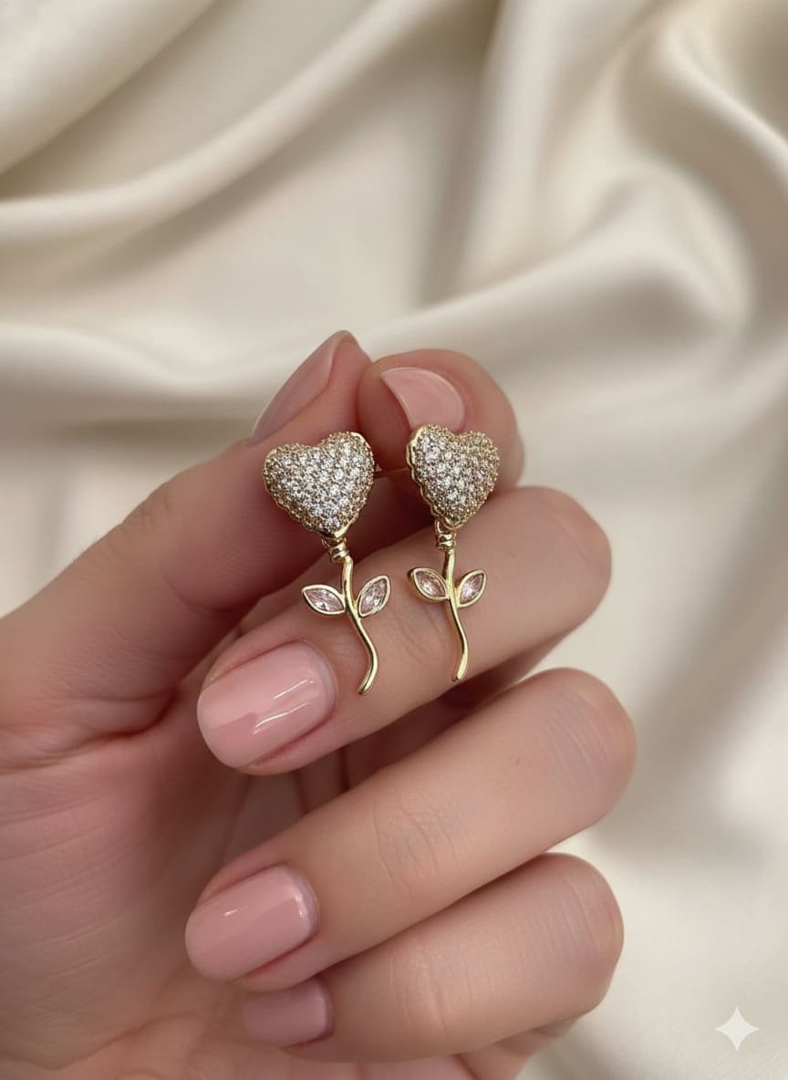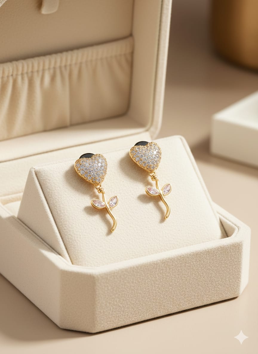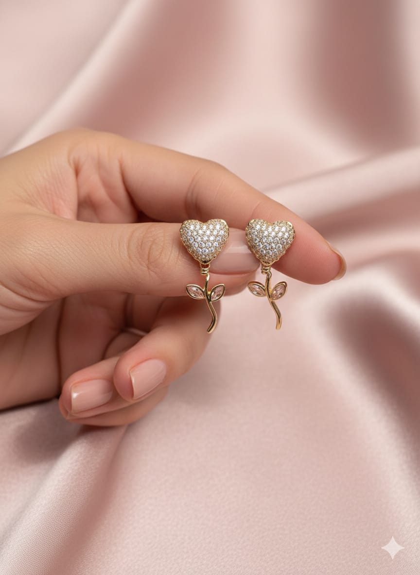 These stunning earrings feature a fully diamond-studded pavé heart top, beautifully paired with a delicate floral drop stem design. The brilliance of high-quality diamond stones combined with rich 18K gold plating creates a radiant sparkle that enhances every outfit.