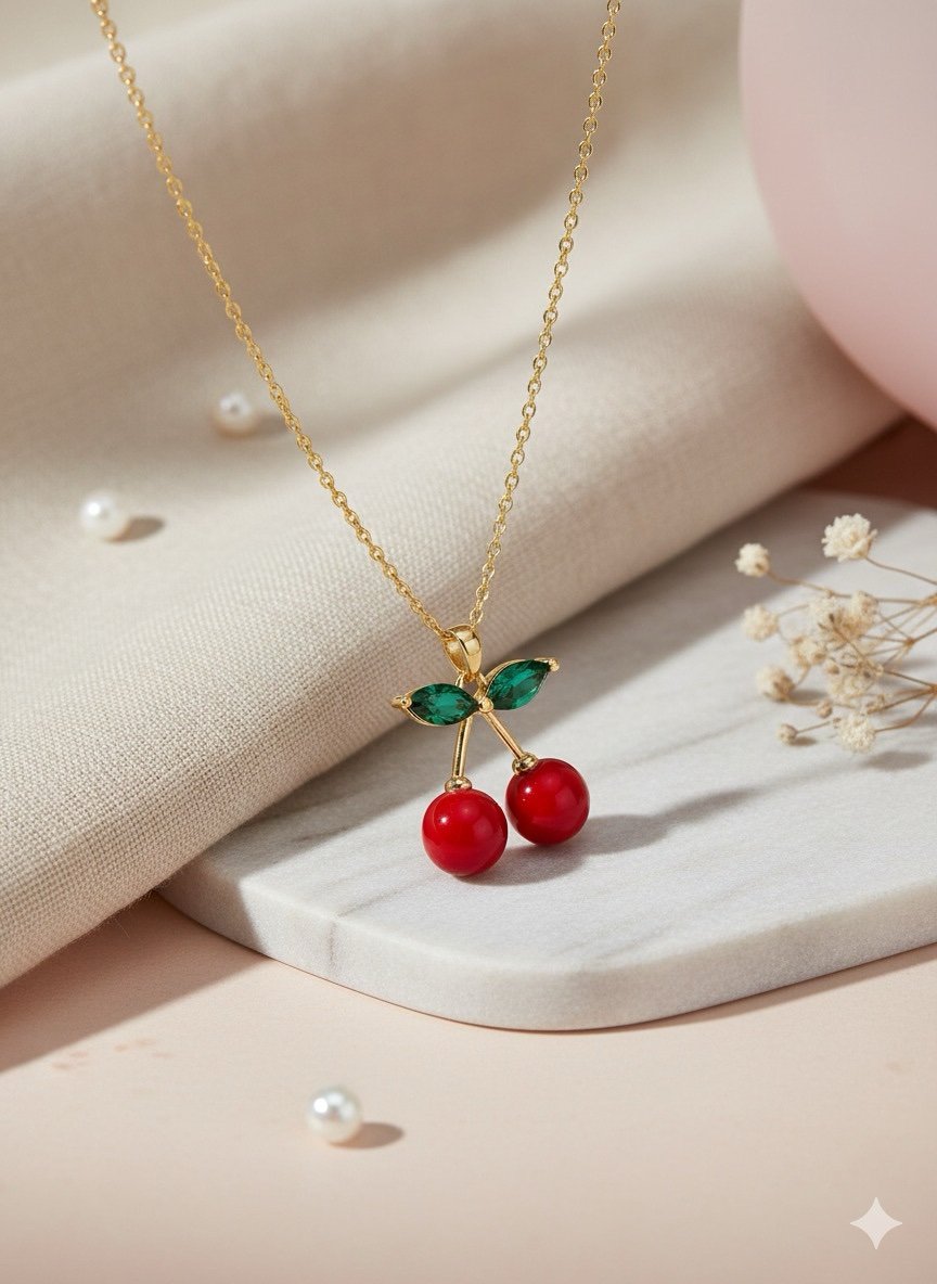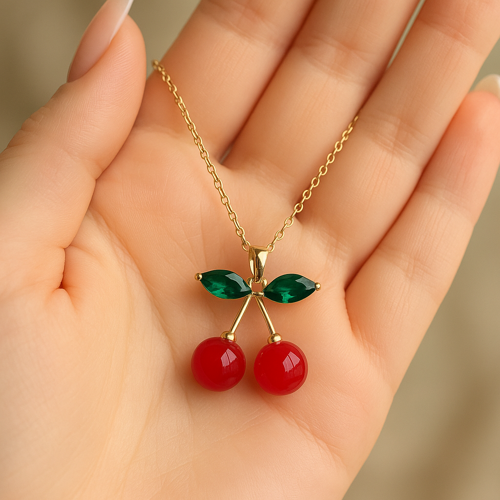🍒 Trendy Design: Cherry-shaped pendant with red stones (cherries) & green stones (leaves)