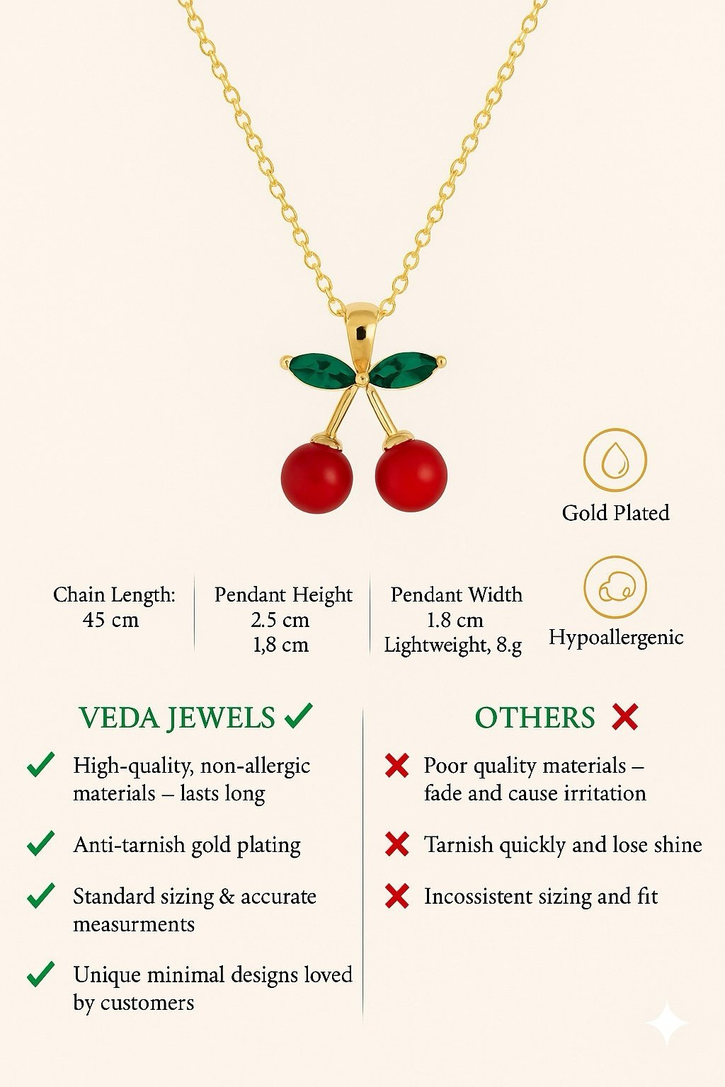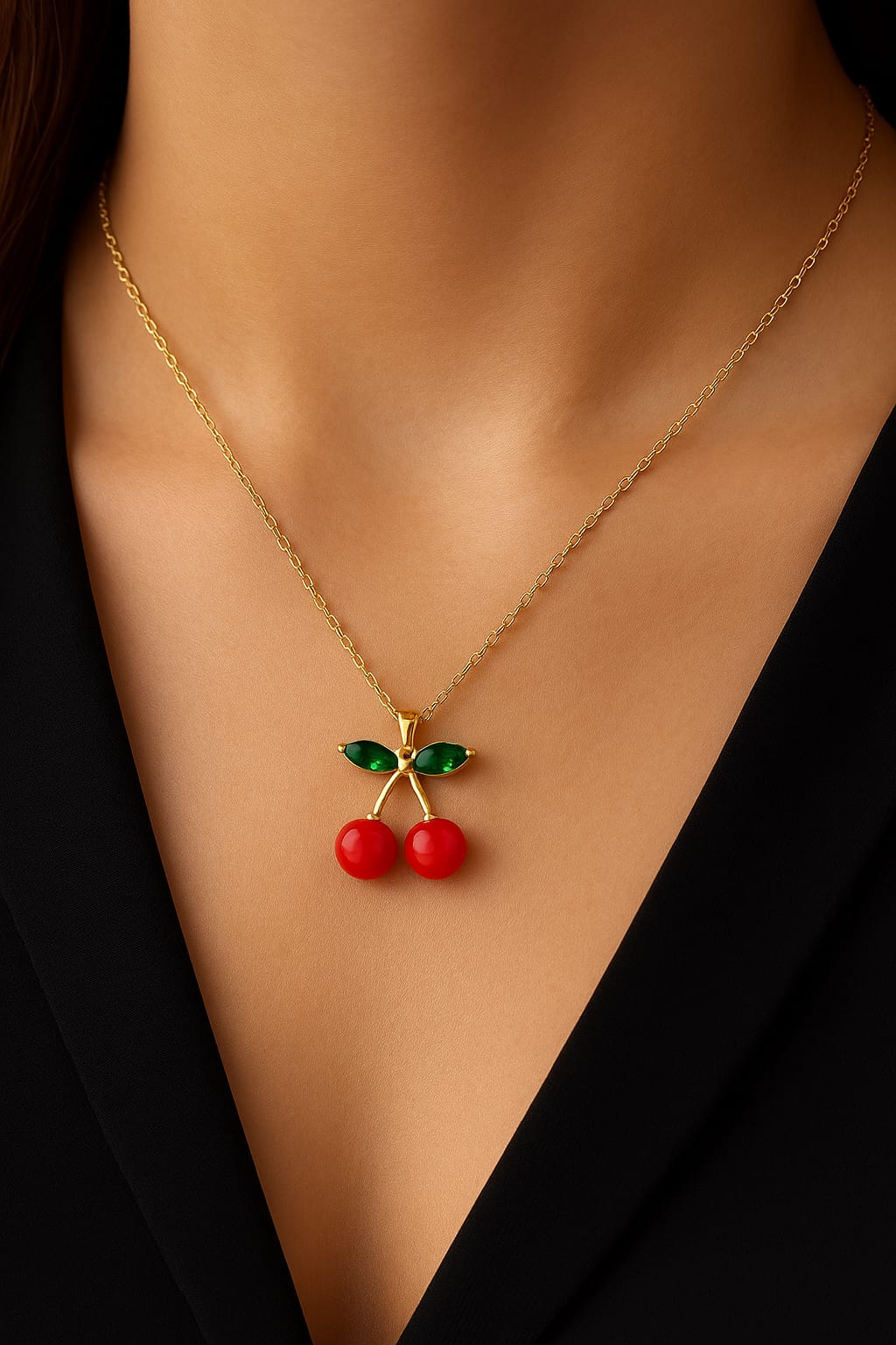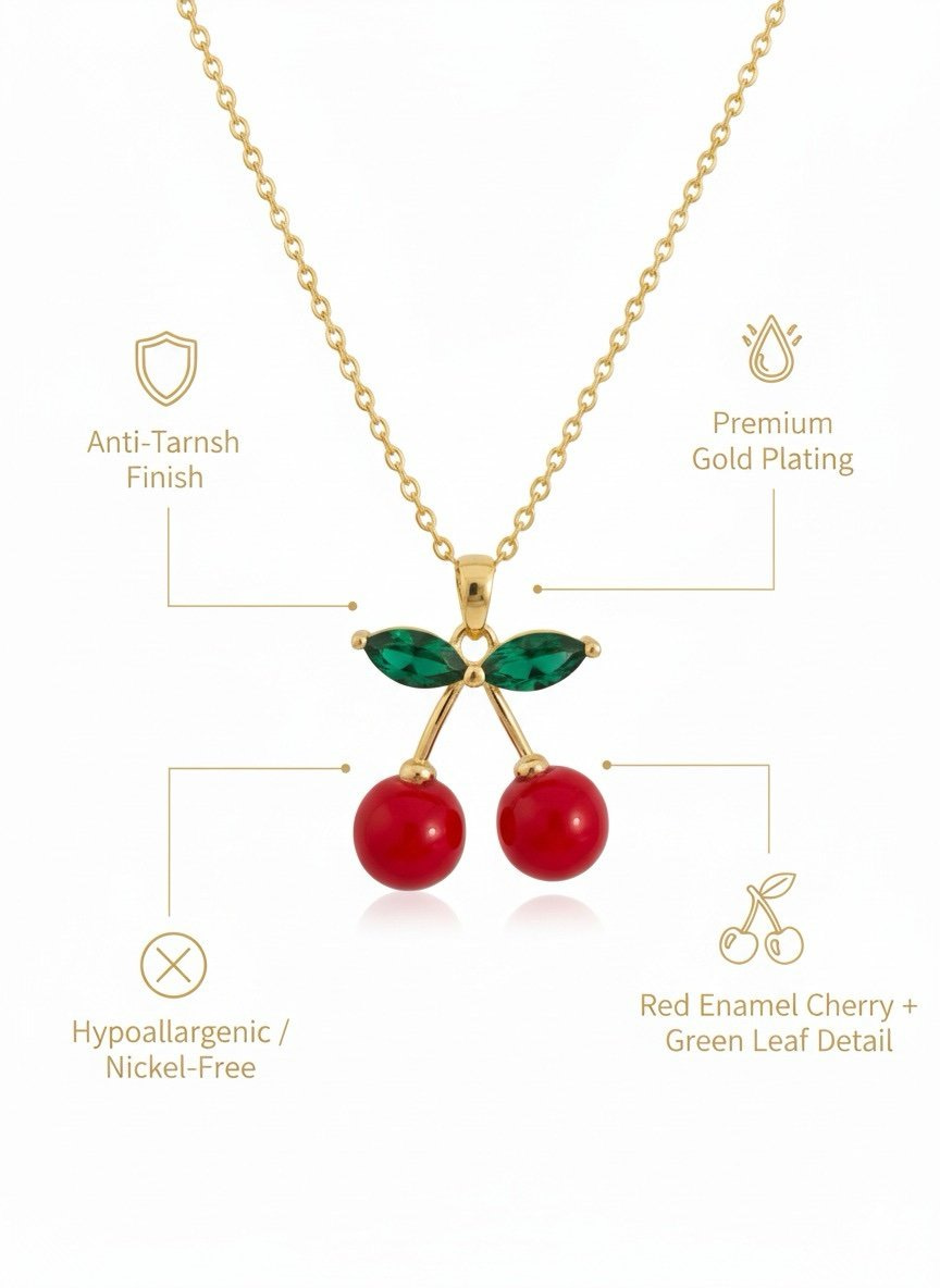 The highlight of this necklace is its adorable cherry motif. The red stones represent fresh cherries, while the green detailing mimics delicate leaves, giving it a lively and vibrant appearance.