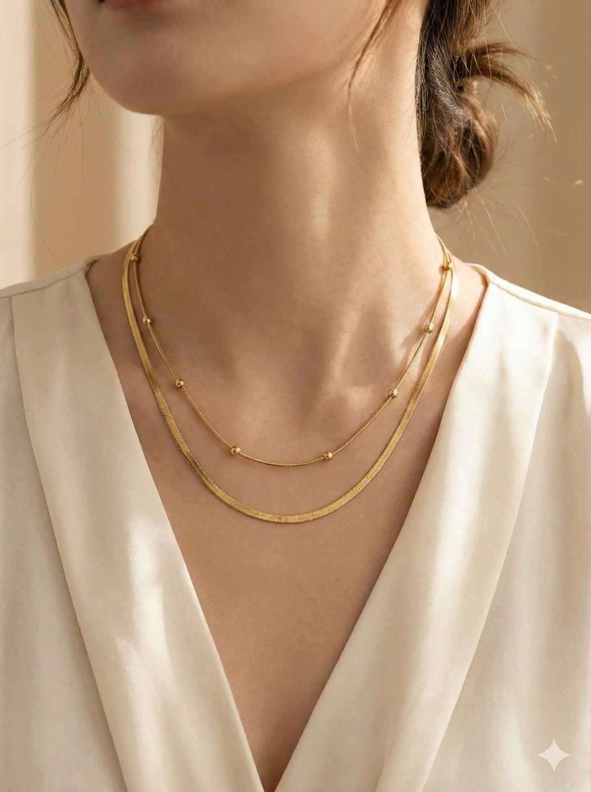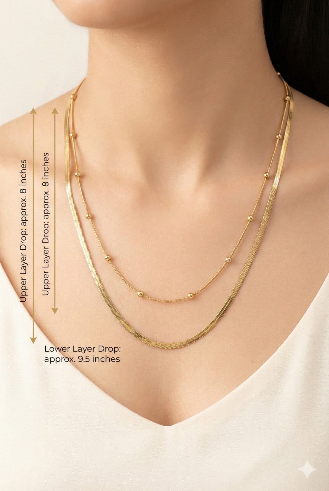 The two chains are thoughtfully placed to create depth and dimension. The upper layer sits closer to the neckline, while the lower layer falls slightly below, creating a graceful cascading effect.