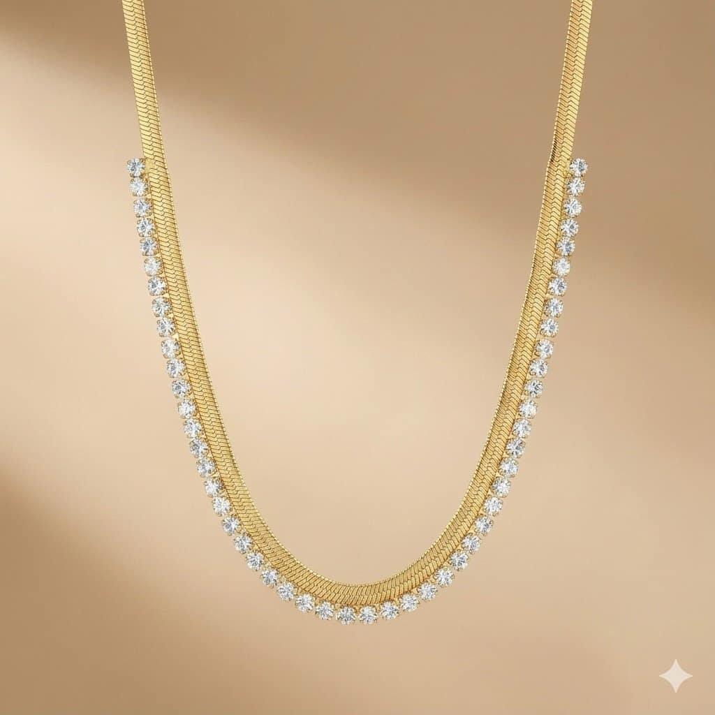 The Elara Diamond-Line Anti-Tarnish Necklace is designed for women who love bold elegance with everyday comfort. Crafted with a smooth gold-plated chain, this necklace sits beautifully along the neckline, offering a structured yet graceful silhouette.