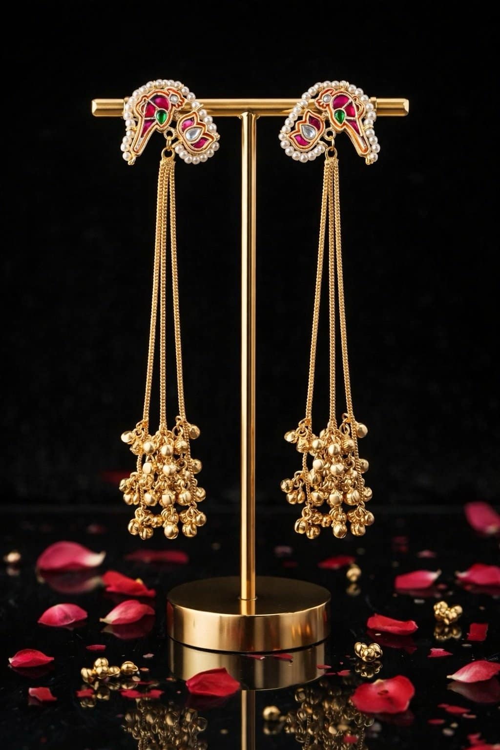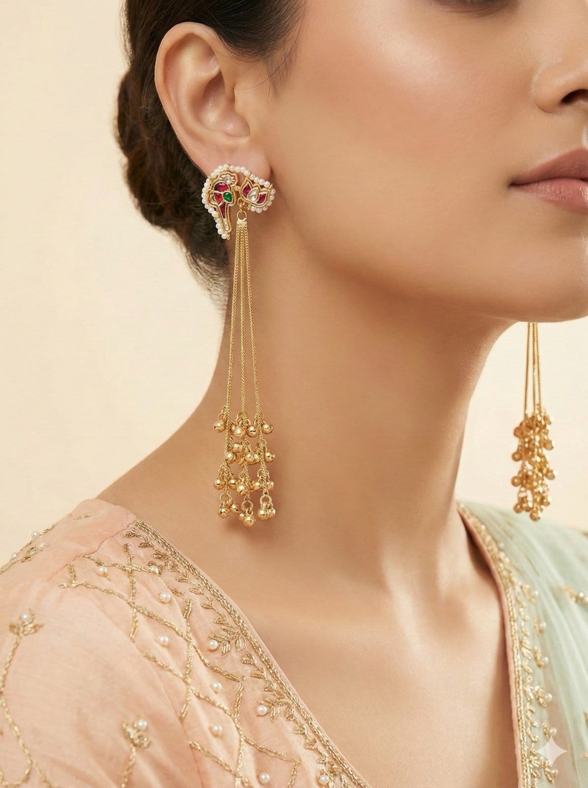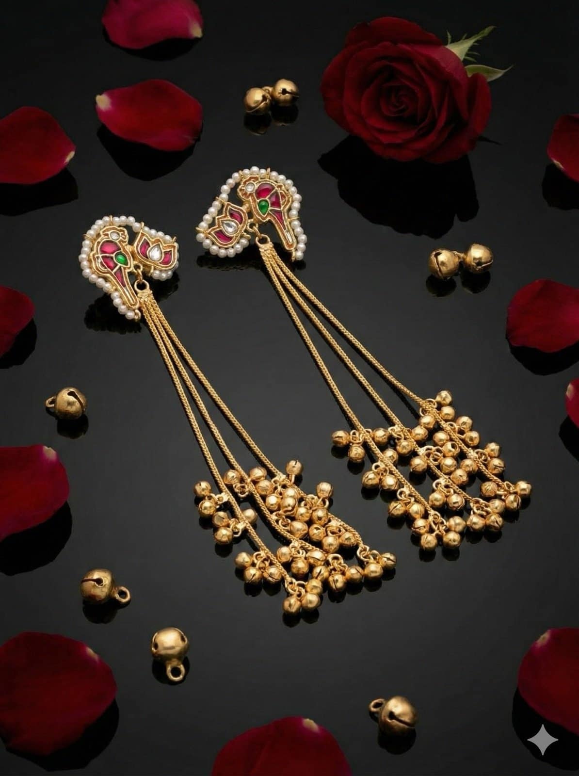 The beautifully detailed kundan-style stud is outlined with delicate pearl edging and accented with red and green stonework, adding a royal touch. Flowing gold chains with ghungroo bead clusters create elegant movement, making these earrings visually striking without feeling heavy.