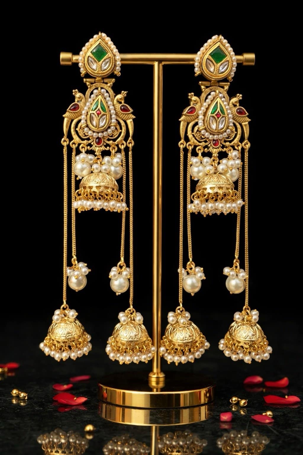 The top showcases exquisite kundan work with green and red stone accents, framed with fine pearl detailing. Multiple layered chains flow into beautifully crafted jhumkas finished with delicate pearl clusters, creating graceful movement and a luxurious appeal.