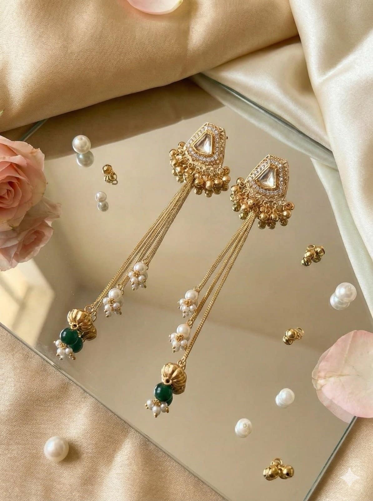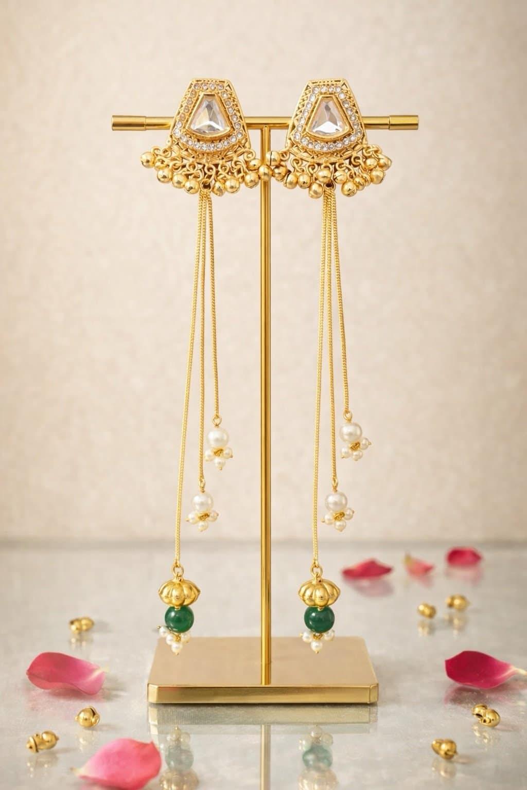 The geometric stud is accented with fine detailing, from which sleek gold chains flow gracefully. Finished with delicate pearl clusters and a hint of green bead detailing at the base, these earrings create gentle movement and a soft festive glow without being heavy.