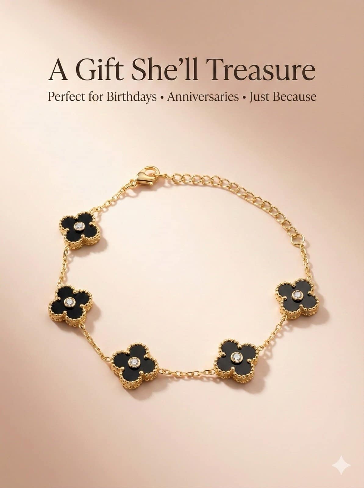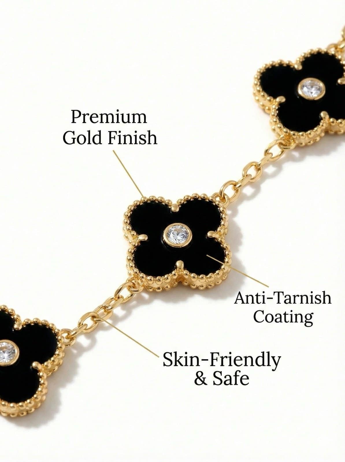 Featuring delicate black clover motifs outlined in a rich gold finish, each charm is accented with a subtle center stone that adds a refined sparkle. The waterproof design allows you to wear it confidently through daily activities, making it perfect for modern, on-the-go lifestyles.