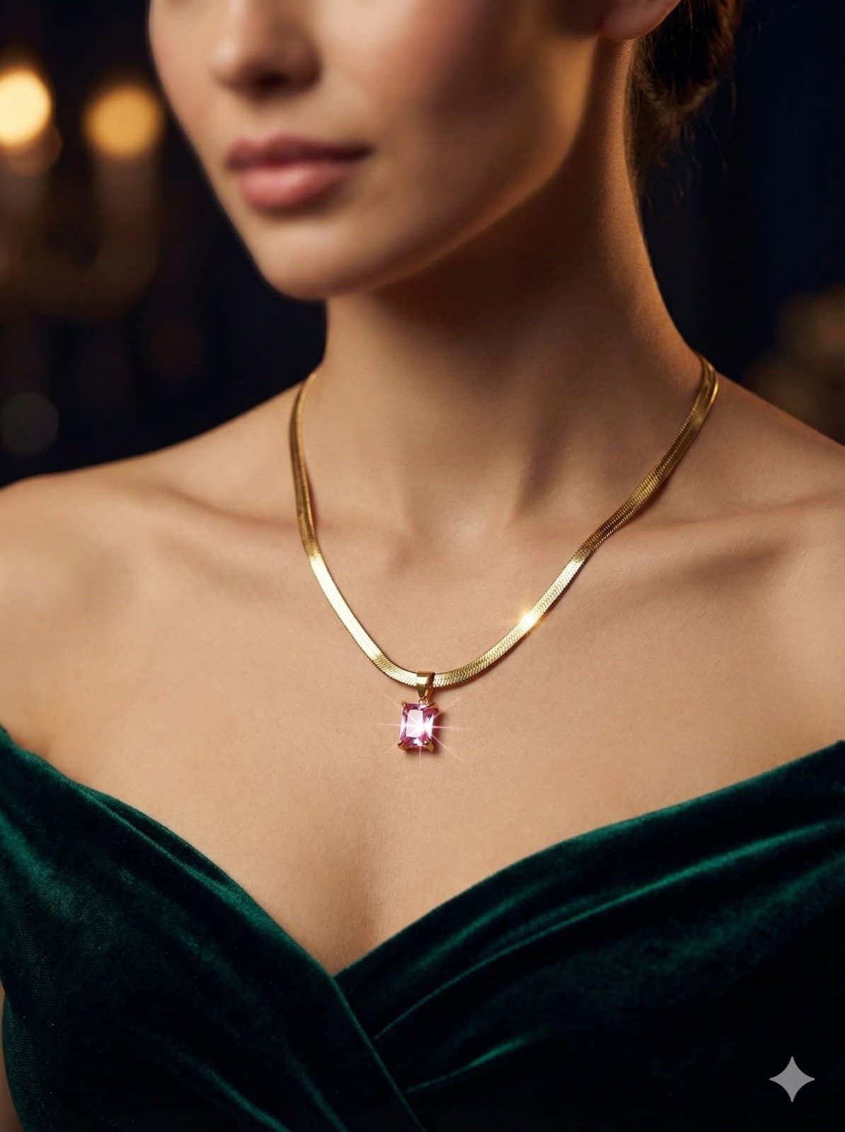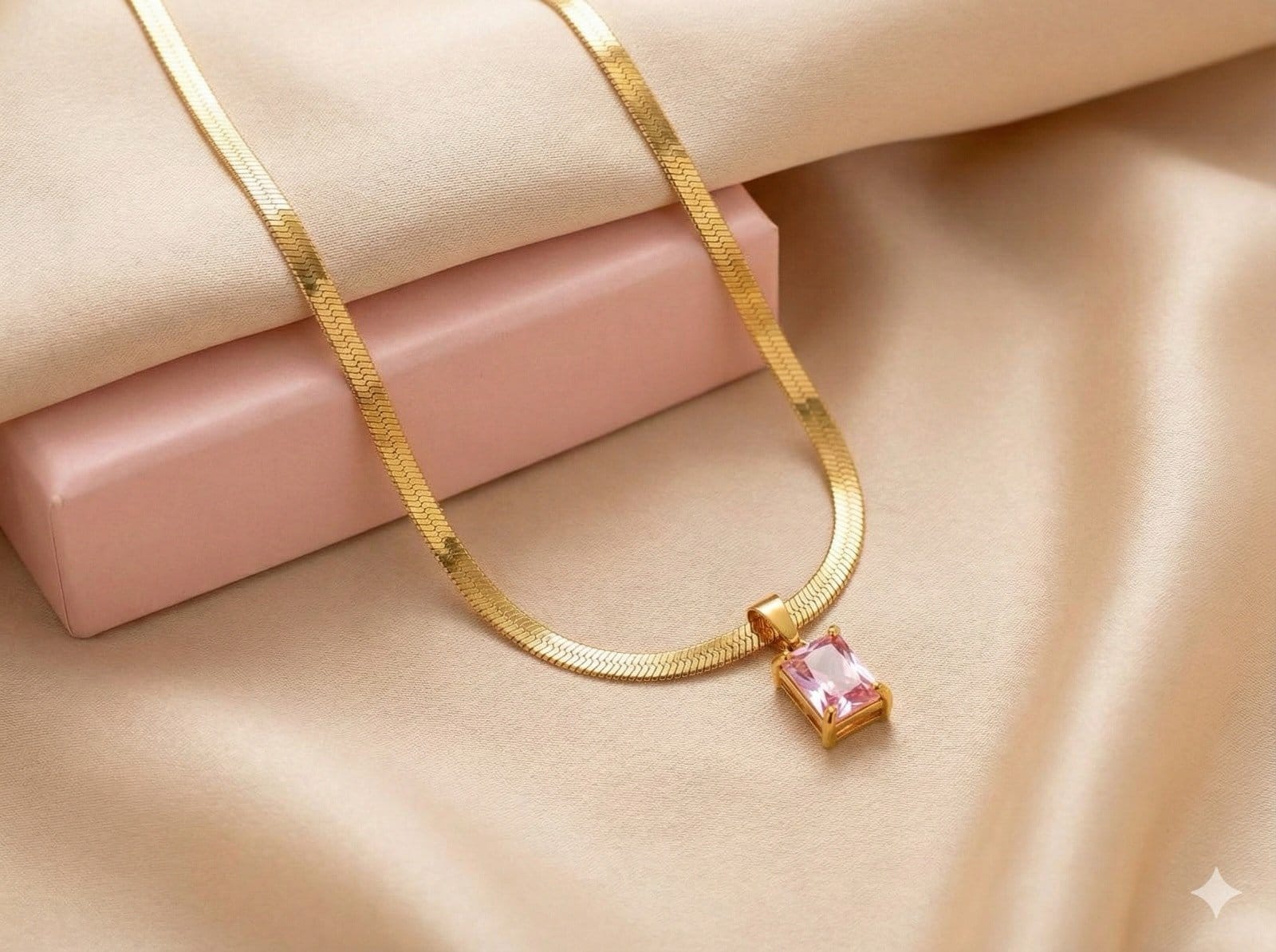 The pink solitaire gold pendant necklace is a timeless and elegant jewellery piece designed for modern women. The pink solitaire gold pendant necklace is a timeless and elegant jewellery piece designed for modern women who love minimal yet sophisticated accessories. Crafted with a premium 18K gold plated finish, this anti tarnish solitaire necklace offers long-lasting shine and durability for everyday wear.