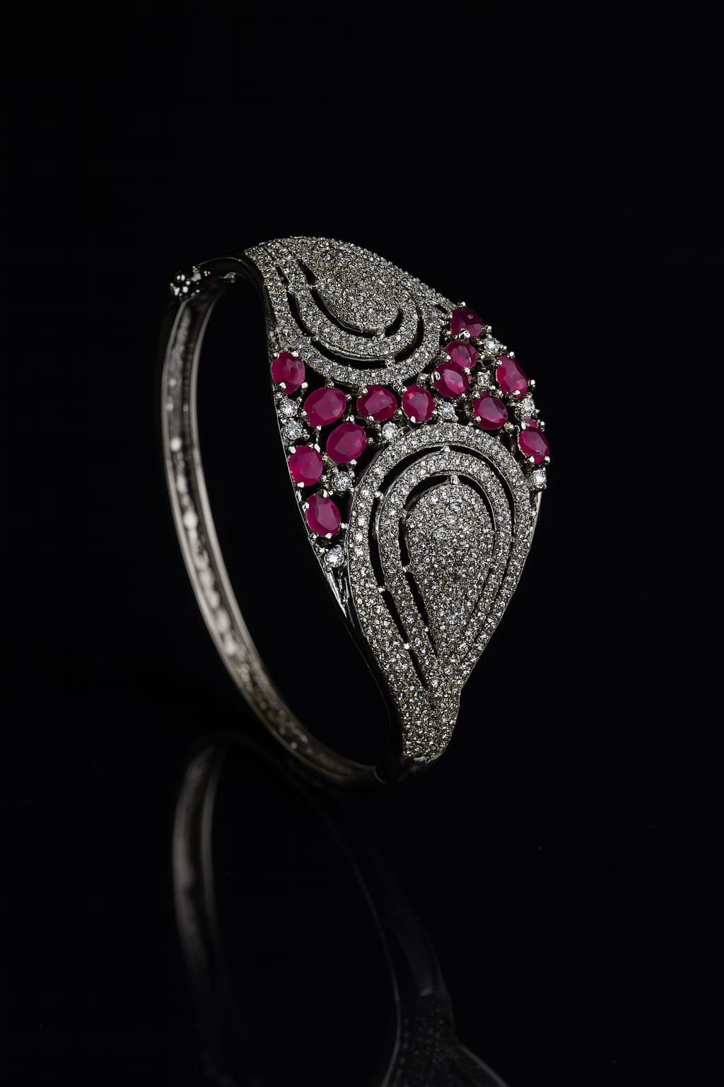 Add a statement of royalty to your collection with our Regal Radiance Ruby Bangle, a true masterpiece of timeless elegance. Designed with exquisite paisley patterns, this bracelet is studded with shimmering American diamonds and deep ruby-hued gemstones that exude a regal charm. The anti-tarnish silver finish ensures it maintains its shine through years of wear, while the intricate craftsmanship reflects luxury in every detail. Whether styled with a saree, lehenga, or Indo-western wear, this bangle makes for a perfect companion to elevate your festive or wedding look.