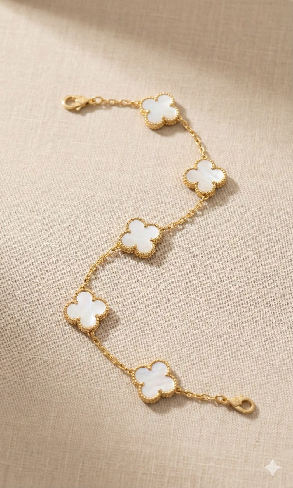Featuring multiple white clover motifs set in a refined gold finish, this bracelet symbolises elegance, positivity and timeless beauty. The delicate chain sits comfortably on the wrist, making it ideal for both everyday wear and special occasions.